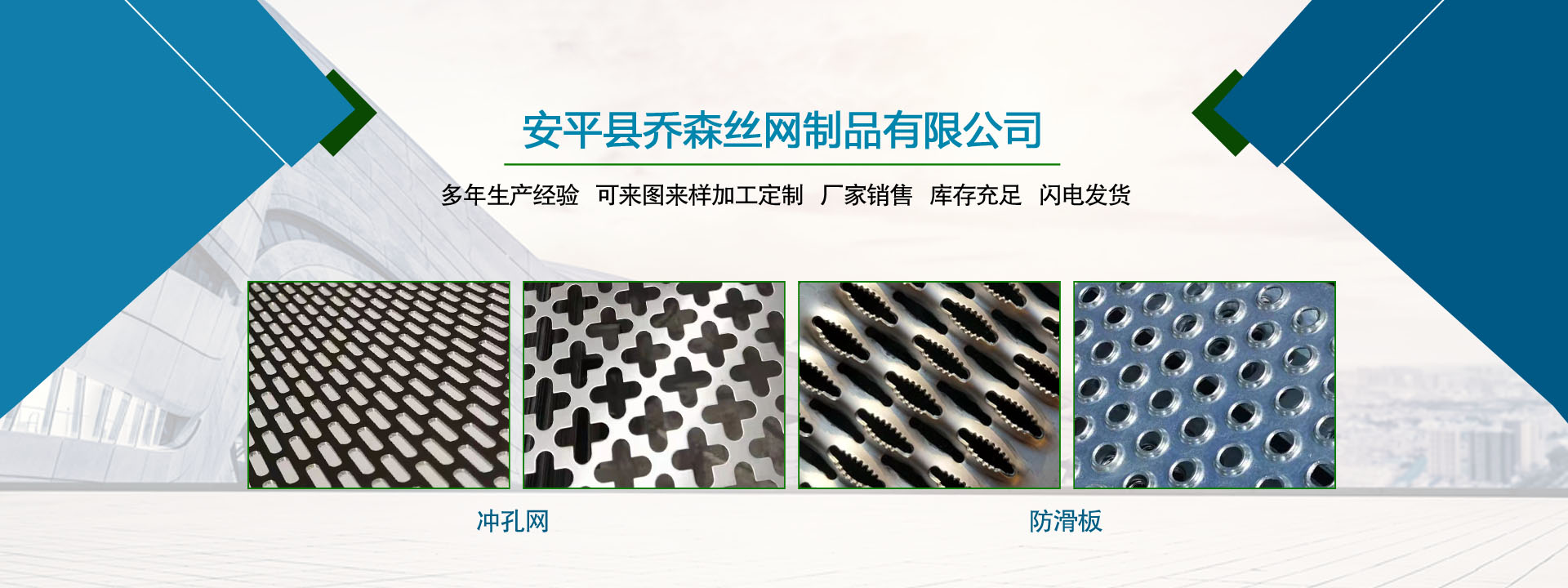 安平縣喬森絲網(wǎng)制品有限公司主營產(chǎn)品:篩網(wǎng)、金屬裝飾網(wǎng)、沖孔網(wǎng)板、防滑板和軋花網(wǎng)。常年現(xiàn)貨供應(yīng)45號(hào)黑鋼絲編織篩網(wǎng)、熱鍍鋅鋼絲篩網(wǎng)、304不銹鋼篩網(wǎng)和冷鍍鋅鐵絲網(wǎng),加工定做耐磨65號(hào)錳鋼絲篩網(wǎng)、菱形孔防堵篩網(wǎng)、養(yǎng)殖用長方孔鐵絲網(wǎng)、金屬裝飾網(wǎng)、盤條 礦篩網(wǎng)等各種鋼絲篩網(wǎng)和建筑用鐵絲網(wǎng)片,歡迎新老客戶前來咨詢洽談合作。
